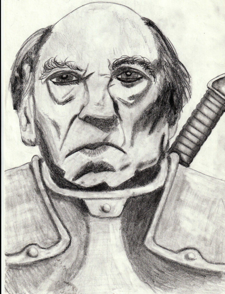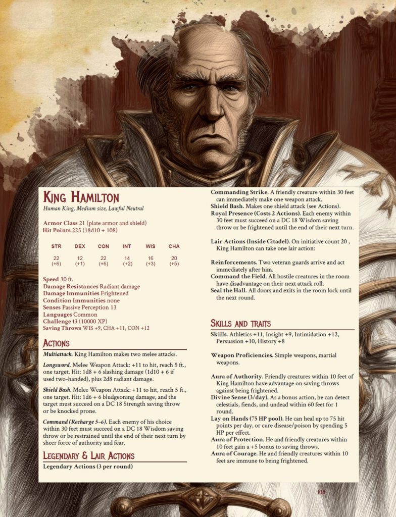 We already talked about image and illustration creation, where AI is a very helpful tool. In many cases we use our own sketches or paintings as initial input to create a set of illustrations. Here is an example from „The City of New Burgh“. First we sketched King Hamilton and scanned him in.